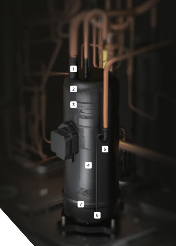 O compressor de alta eficiência EVI foi desenvolvido tendo em conta as características das unidades VRF, a sua gama de regulação de 0-420 Hz e está perfeitamente sintonizado para obter o máximo desempenho. 2 2